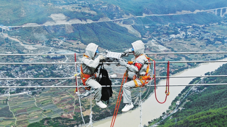 两名电力工人在线路上安装非电气量集成传感器。(资料图片)