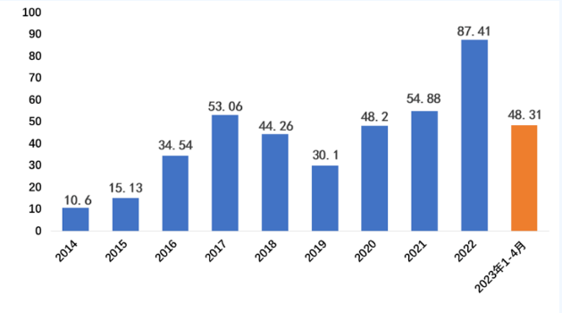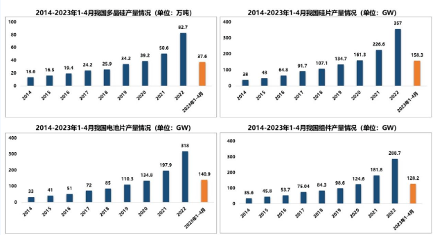 图1 2014—2023年1—4月我国光伏行业生产情况