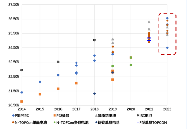 在内外部环境的共同推动下,我国光伏企业加大工艺技术研发力度,生产工艺水平不断进步,不断刷新纪录。据中国光伏行业协会统计,2014—2022年,我国企业、研究机构晶硅电池实验室效率共打破世界纪录56次;2022年,刷新效率纪录14次,其中10次为n型电池技术。未来随着生产成本的降低及良率的提升,n型电池将会成为电池技术的主要发展方向之一。
